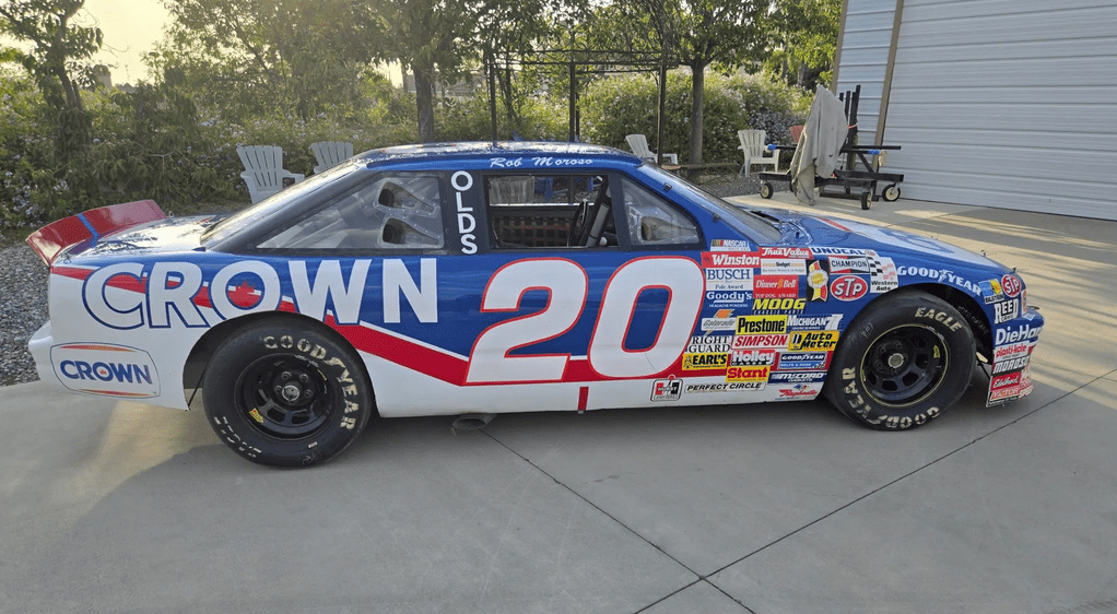 According to the Bring A Trailer listing, the Cutlass appeared in multiple superspeedway races. Rob Moroso drove the No. 20 Crown Petroleum entry during his rookie season, and he used it to finish a career-best ninth at Daytona in the summer.
