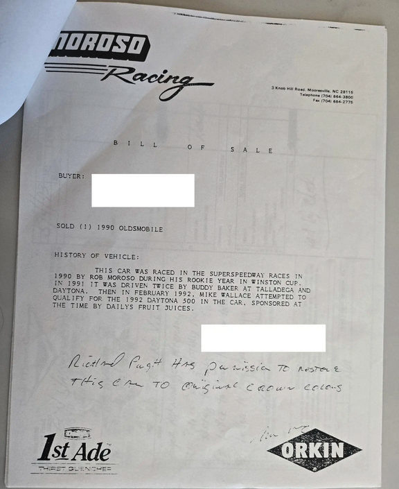 Moroso passed away in a September 1990 car crash. The paperwork on the auction site noted that Buddy Baker then controlled the entry at Daytona and Talladega during the 1991 season. He posted a pair of 13th-place finishes.