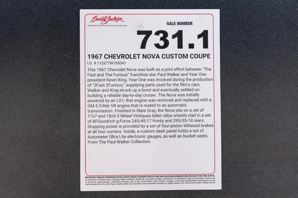 YearOne Parts did the modifications to the Chevy II Nova before the presentation in 2004. This followed the production of 2003’s “2 Fast 2 Furious,” which starred Walker and Tyrese Gibson in lead roles. The cast also featured Cole Hauser, Ludacris, and Eva Mendes.