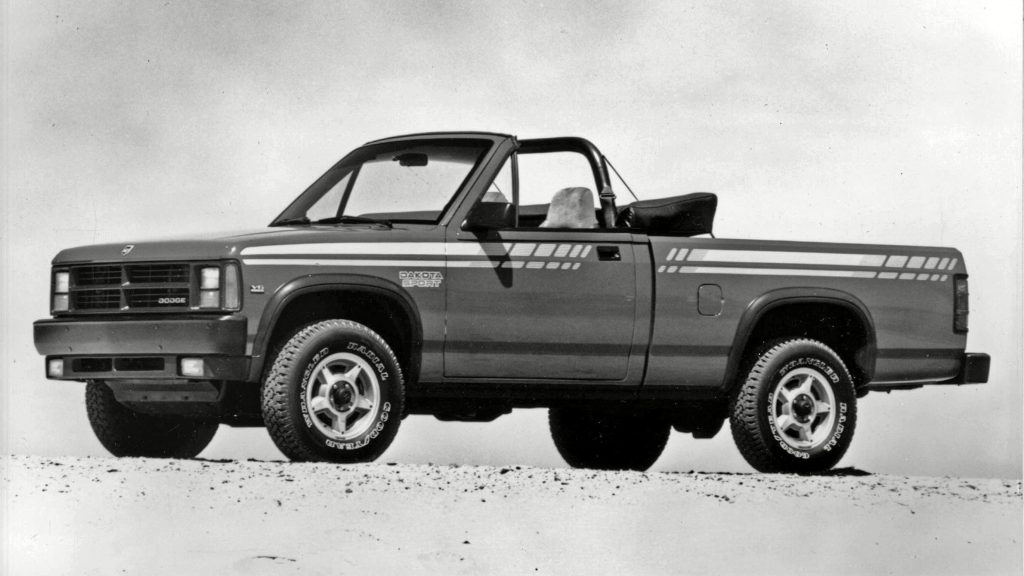 The Dakota was Dodge’s mid-size pickup, which could compete with the Ford Ranger and the Chevrolet S-10. This truck also offered a “sport convertible option” for those who wanted to drop the top while hauling cargo.