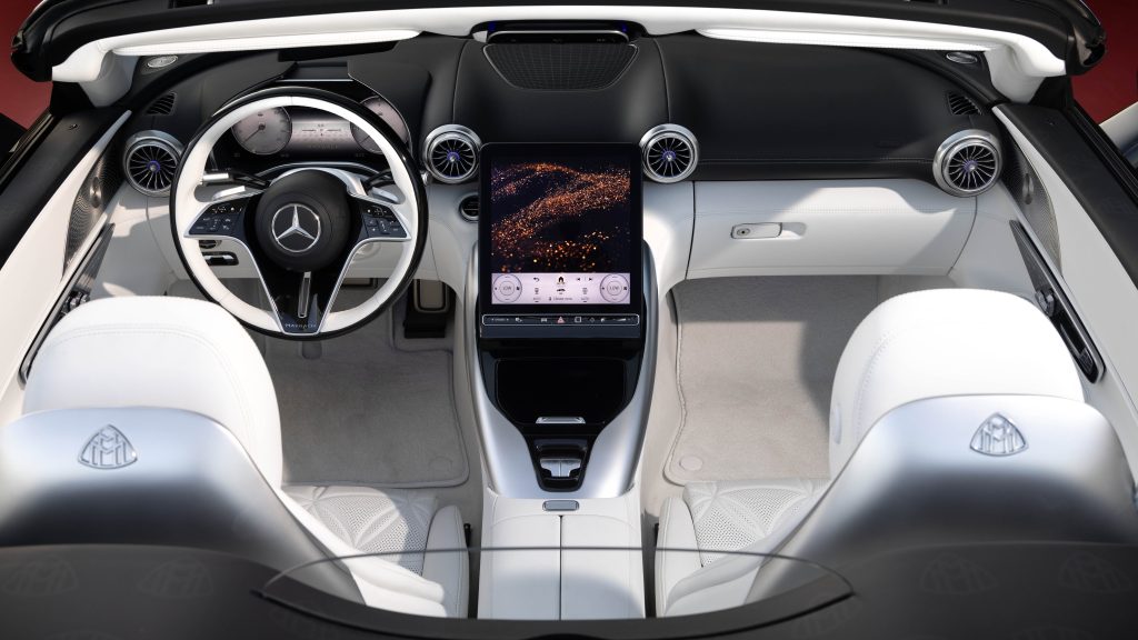 The interior of the SL 680 Monogram Series features “sustainably tanned, MANUFAKTUR Crystal White Exclusive Nappa leather.” It extends to the door panels, center console, and space behind the seats.
